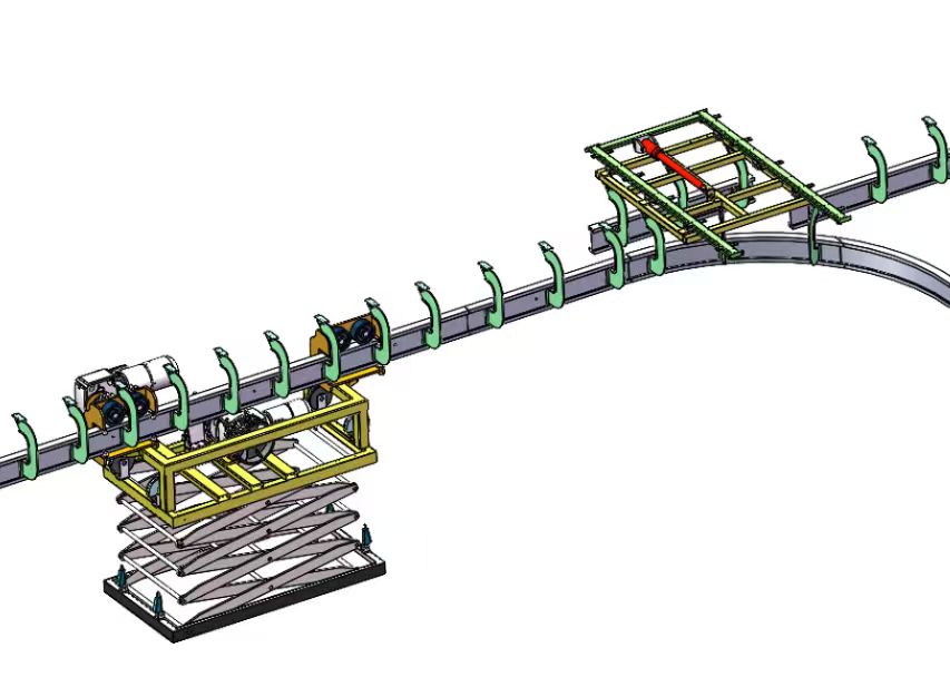 此智能空中輸送系統配備了剪叉式升降機,小車在取放貨物時自動下降升降機,更方便接駁貨物。